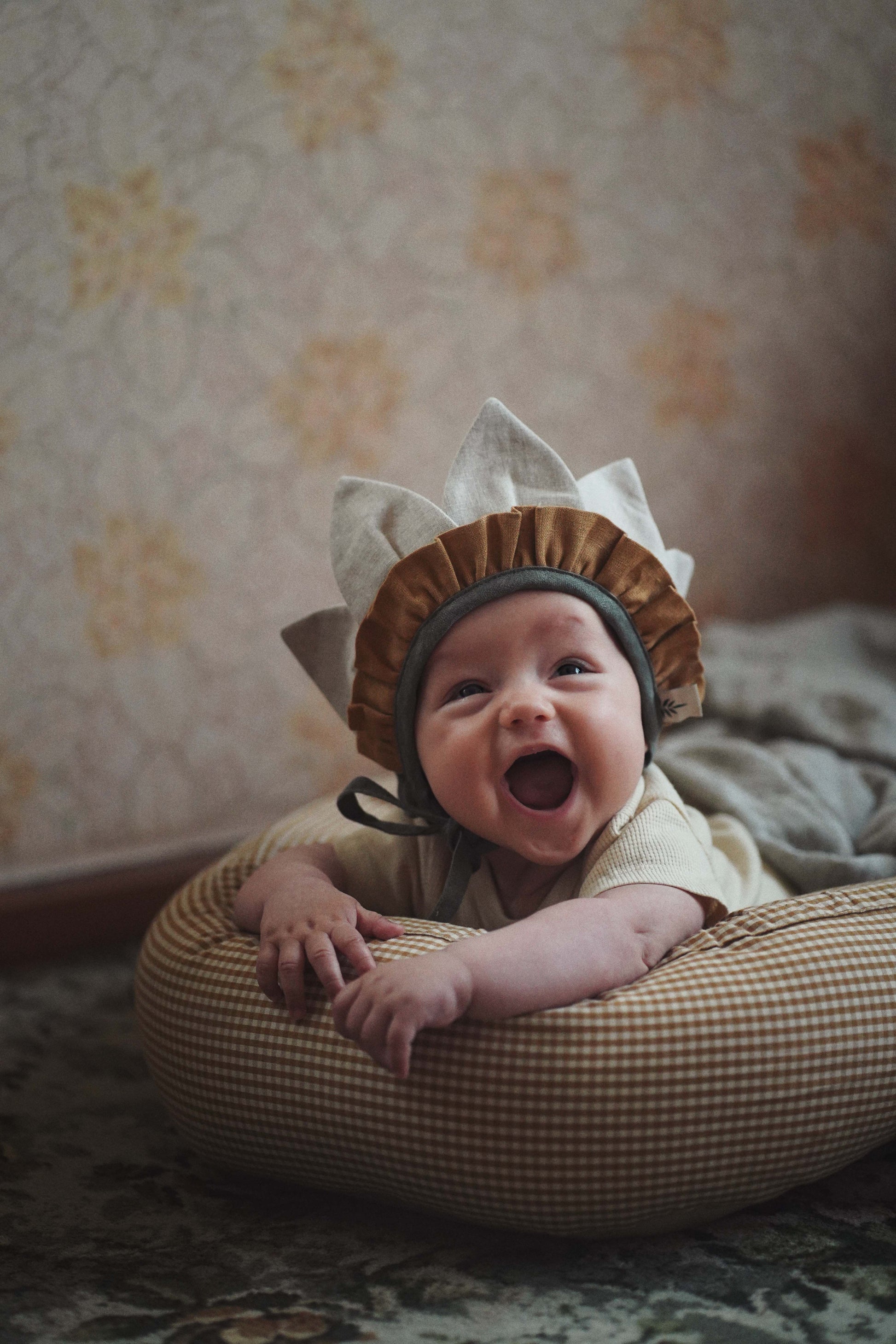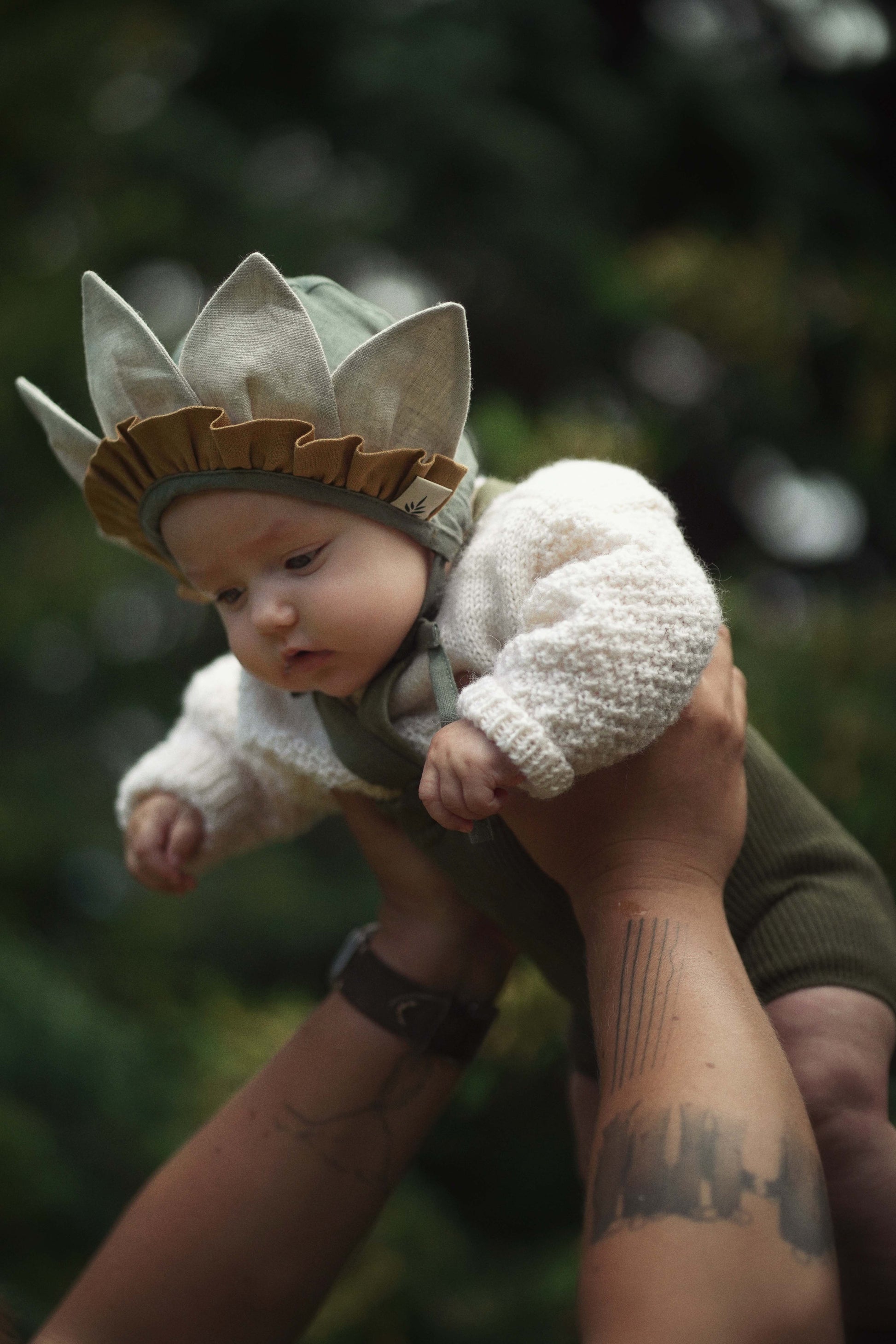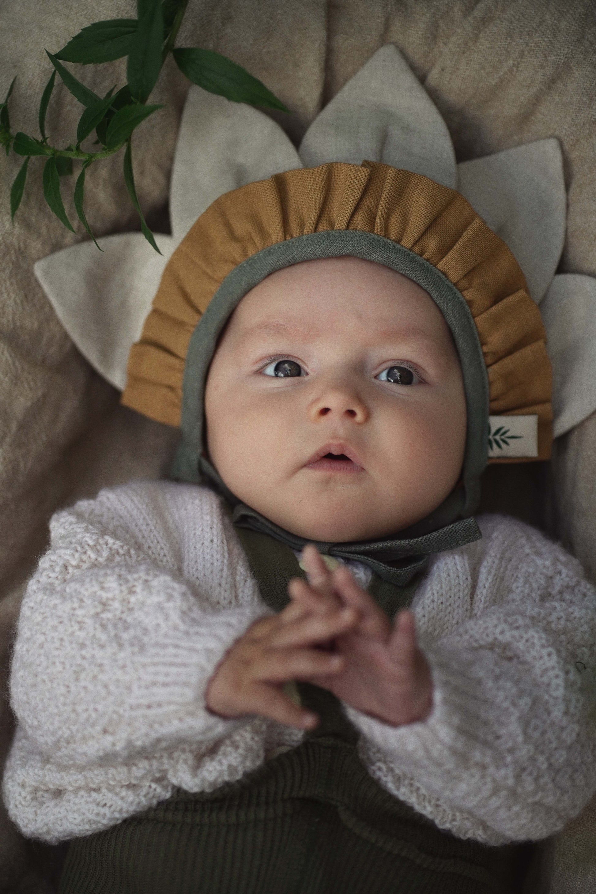 やさしいリネン素材の紐で首元を結ぶ仕様で、サイズ調整がしやすく、風でずれにくいデザイン。