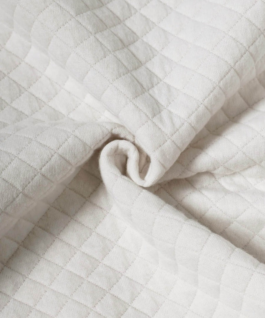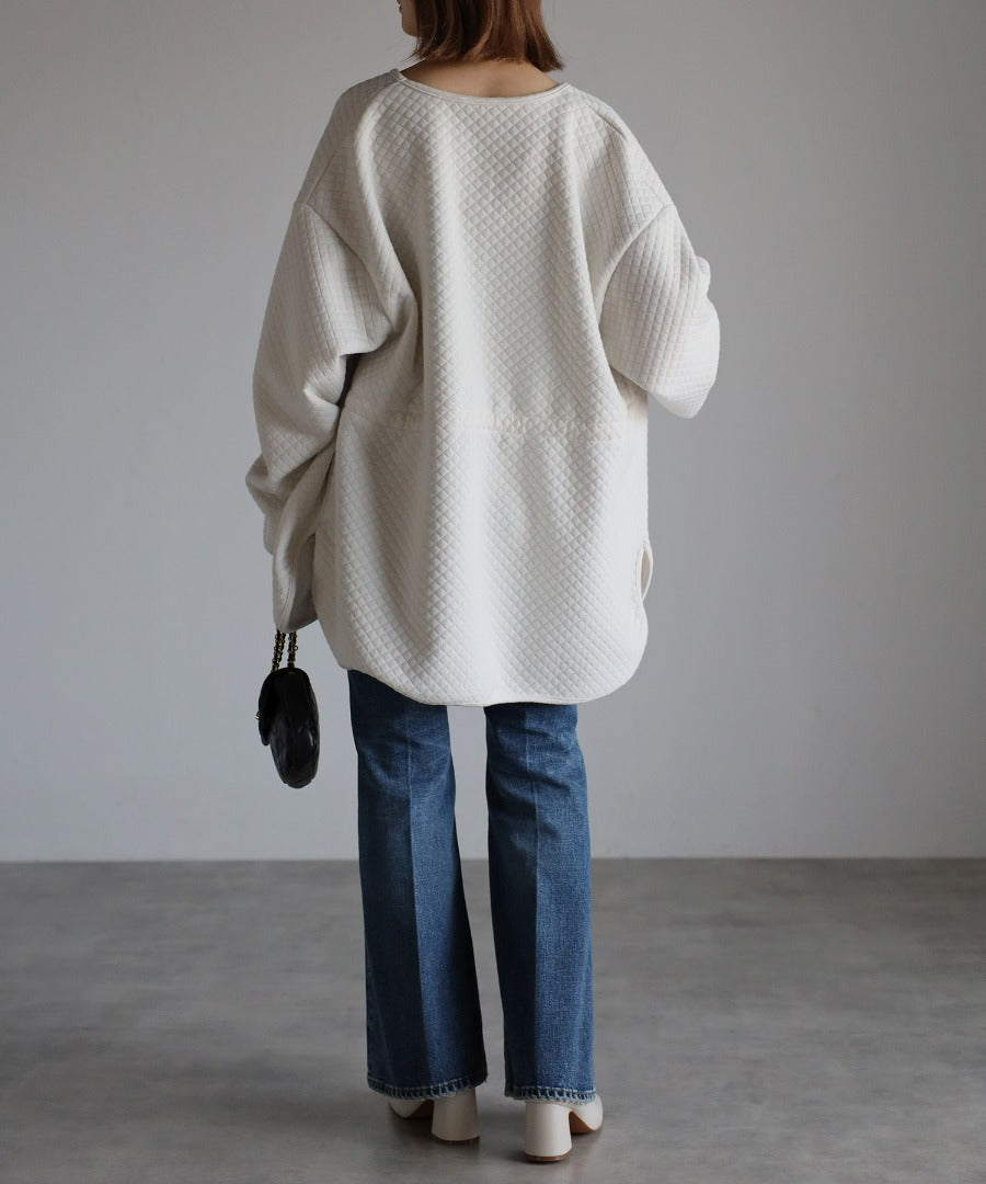 肌触りの良い柔らかい風合いのキルト柄ノーカラーカーディガン。